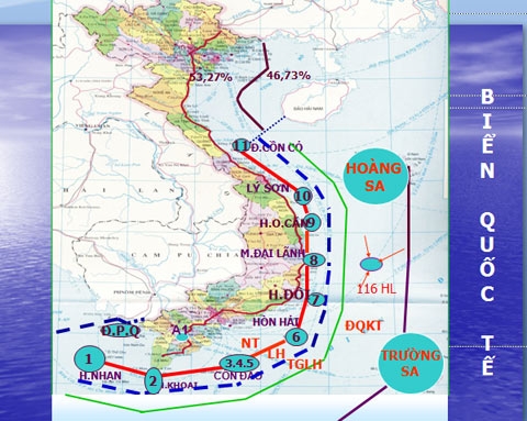 Đường màu đỏ nối 11 điểm từ hòn Nhạn đến Cồn Cỏ gọi là đường cơ sở, đường gạch đứt quãng màu xanh gọi là biên giới quốc gia trên biển).