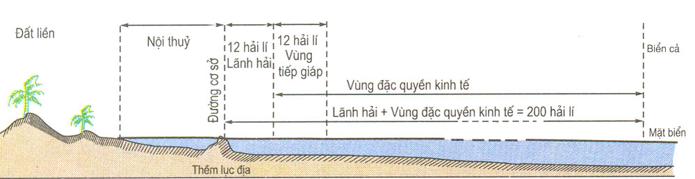 Thông tin: - Nội thủy là vùng nước ở phía trong đường cơ sở và giáp với bờ biển. Đường cơ sở là đường nối liền các điểm nhô ra nhất của bờ biển và các điểm ngoài cùng của các đảo ven bờ tính từ ngấn nước thủy triều thấp nhất trở ra. - Lãnh hải nước ta có chiều rộng 12 hải lí. Ranh giới phía ngoài của lãnh hải được gọi là biên giới quốc gia trên biển; trên thức tế đó là đường song song và cách điều đường cơ sở về phía biển 12 hải lí. - Vùng tiếp giáp lãnh hải là vùng biển được quy định nhằm đảm bảo cho việc thực hiện chủ quyền đất nước. Vùng tiếp giáp lãnh hải được quy định là 12 hải lí. Trong vùng này nước ta có quyền thực hiện các biện pháp để bảo vệ an ninh , kiểm soát thuế quan, các quy định về y tế, môi trường, di cư, nhập cư... - Vùng đặc quyền kinh tế tiếp liền lãnh hải và hợp với lãnh hải thành một vùng biển có chiều rộng 200 hải lí, tính từ đường cơ sở. Ở vùng này, nước ta có chủ quyền hoàn toàn về kinh tế. - Thềm lục địa nước ta gồm đáy biển và lòng đất dưới đáy biển thuộc phần kéo dài tự nhiên của lục địa Việt Nam, mở rộng ra ngoài lãnh hải Việt Nam cho đến bờ ngoài của rìa lục địa.
