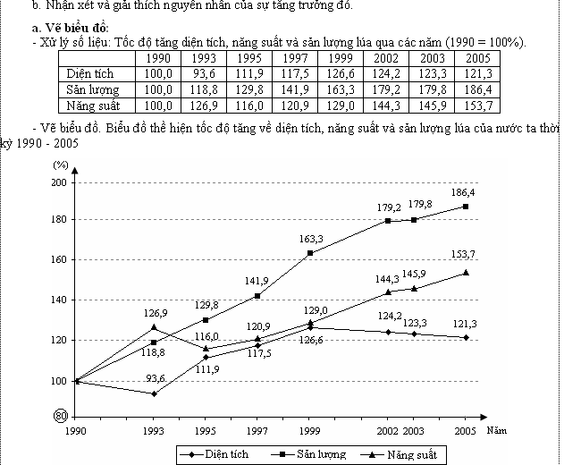 1. Biểu đồ tròn Dấu hiệu nhận biết Bạn sẽ sử dụng biểu đồ tròn khi đề yêu cầu vẽ biểu đồ mô tả cơ cấu, tỉ lệ các thành phần trong một tổng thể. Để ý xem đề ra cho nhiều thành phần để thể hiện trong 1 hoặc 2 mốc năm thì phải lựa chọn biểu đồ tròn nhé. Hãy luôn nhớ chọn biểu đồ tròn khi “ít năm, nhiều thành phần” Các bước tiến hành khi vẽ biểu đồ hình tròn Bước 1 : Xử lí số liệu ( Nếu số liệu của đề bài cho là số liệu thô ví dụ như tỉ đồng , triệu người thì ta phải đổi sang số liệu về dạng % Bước 2 : Xác định bán kính của hình tròn Lưu ý : Bán kính của hình tròn cần phù hợp với khổ giấy để đảm bảo tính trực quan và mĩ thuật cho bản đồ .Trong trường hợp phải vẽ biểu đồ bằng những hình tròn có bán kính khác nhau thì ta phait tính toán bán kính cho các hình tròn Bước 3 : Chia hình tròn thành những nan quạt theo đúng tỉ lệ và trật tự của các thành phần có trong đề bài cho Lưu ý : toàn bộ hình tròn là 360 độ , tướng ứng với tỉ lệ 100% . Như vậy , tỉ lệ 1% ứng với 3,6 độ trên hình tròn Khi vẽ các nan quạt nên bắt đầu từ tia 12 giờ và lần lượt vẽ theo chiều thuận với chiều quay của kim đồng hồ .Thứ tự các thành phần của các biểu đồ phải giống nhau để tiện cho việc so sánh Bước 4 : Hoàn thiện bản đồ (ghi tỉ lệ của các thành phần lên biểu đồ ,tiếp ta sẽ chọn kí hiệu thể hiện trên biểu đồ và lập bant chú giải cuối cùng ta ghi tên biểu đồ) ![]() Trường hợp phải vẽ biểu đồ bằng những hình tròn có bán kính khác nhau thì ta phải tính toán bán kính cho các hình tròn Các dạng biểu đồ tròn: • Biểu đồ tròn đơn. • Biểu đồ tròn có các bán kính khác nhau. • Biểu đồ bán tròn (hai nửa hình tròn thường thể hiện cơ cấu giá trị xuất nhập khẩu. Cách nhận xét Khi chỉ có một vòng tròn: Ta nhận định cơ cấu tổng quát lớn nhất là cái nào, nhì là, ba là… và cho biết tương quan giữa các yếu tố (gấp mấy lần hoặc kém nhau bao nhiêu %). đặc biệt là yếu tố lớn nhất so với tổng thể có vượt xa không? Lưu ý : Tỷ trọng có thể giảm nhưng số thực nó lại tăng, vì thế cần ghi rõ. Ví dụ: Xét về tỷ trọng ngành nông nghiệp giảm… không ghi trống kiểu ngành nông nghiệp giảm … vì như thế là chưa chính xác, có thể bị trừ hay không được cho điểm. Khi có từ hai vòng tròn trở lên (giới hạn tối đa là ba hình tròn cho một bài) - Nhận xét cái chung nhất (nhìn tổng thế): Tăng/ giảm như thế nào? - Nhận xét tăng hay giảm trước, nếu có ba vòng trở lên thì thêm liên tục hay không liên tục, tăng (giảm) bao nhiêu? - Sau đó mới nhận xét về nhất, nhì, ba … của các yếu tố trong từng năm, nếu giống nhau thì ta gom chung lại cho các năm một lần thôi (không nhắc lại 2, 3 lần) - Cuối cùng, cho kết luận về mối tương quan giữa các yếu tố. - Giải thích về vấn đề. Biểu đồ miền Dấu hiệu nhận biết Bạn sẽ thường hay nhầm lẫn giữa vẽ biểu đồ miền và biểu đồ tròn, tuy nhiên 2 loại này sẽ có những dấu hiệu nhận biết nhất định. Biểu đồ miền còn được gọi là biểu đồ diện. Loại biểu đồ này thể hiện được cả cơ cấu và động thái phát triển của các đối tượng. Toàn bộ biểu đồ là 1 hình chữ nhật (hoặc hình vuông ), trong đó được chia thành các miền khác nhau Chọn vẽ biểu đồ miền khi cần thể hiện cơ cấu tỉ lệ. Để xác định vẽ biểu đồ miền, với số liệu được thể hiện trên 3 năm (nghĩa là việc vẽ tới 4 hình tròn như thông thường thì ta lại chuyển sang biểu đồ miền). Vậy số liệu đã cho cứ trên 3 năm mà thể hiện về cơ cấu thì vẽ biểu đồ miền. Dấu hiệu: Nhiều năm, ít thành phần Các bước tiến hành khi vẽ biểu đồ miền Bước 1 : Vẽ khung biểu đồ. - Khung biểu đồ miễn vẽ theo giá trị tương đối thường là một hình chữ nhật. Trong đó được chia làm các miền khác nhau, chồng lên nhau. Mỗi miền thể hiện một đối tượng địa lí cụ thể. - Các thời điểm năm đầu tiên và năm cuối cùng của biểu đồ phải được năm trên 2 cạnh bên trái và phải của hình chữ nhật, là khung của biểu đồ. - Chiều cao của hình chữ nhật thể hiện đơn vị của biểu đồ, chiều rộng của biểu đồ thường thể hiện thời gian (năm). - Biều đồ miền vẽ theo giá trị tuyệt đối thể hiện động thái, nên dựng hai trục – một trục thể hiện đại lượng, một trục giới hạn năm cuối (dạng này ít, thông thường chỉ sử dụng biểu đồ miền thể hiện giá trị tương đối). Bước 2: Vẽ ranh giới của miền. Lấy năm đầu tiên trên trục tung, phân chia khoảng cách năm theo tỉ lệ tương ứng. Bước 3 : Hoàn thiện biểu đồ. Ghi số liệu vào đúng vị trí từng miền trong biểu đồ đã vẽ. ![]() Toàn bộ biểu đồ miền là 1 hình chữ nhật (hoặc hình vuông ), trong đó được chia thành các miền khác nhau Một số dạng biểu đồ miền thường gặp : + Biểu đồ miền chồng nối