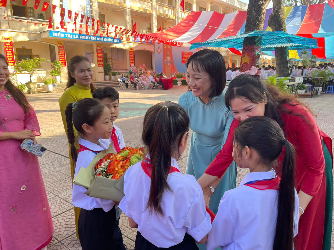 Đại diện lãnh đạo địa phương đã lên sân khấu trao tặng lẵng hoa chúc mừng thầy và trò nhà trường, đồng thời gửi gắm niềm tin tưởng vào một năm học mới thành công. Những bó hoa tươi thắm chính là sự ghi nhận, động viên to lớn, tiếp thêm sức mạnh để tập thể sư phạm nỗ lực phấn đấu.