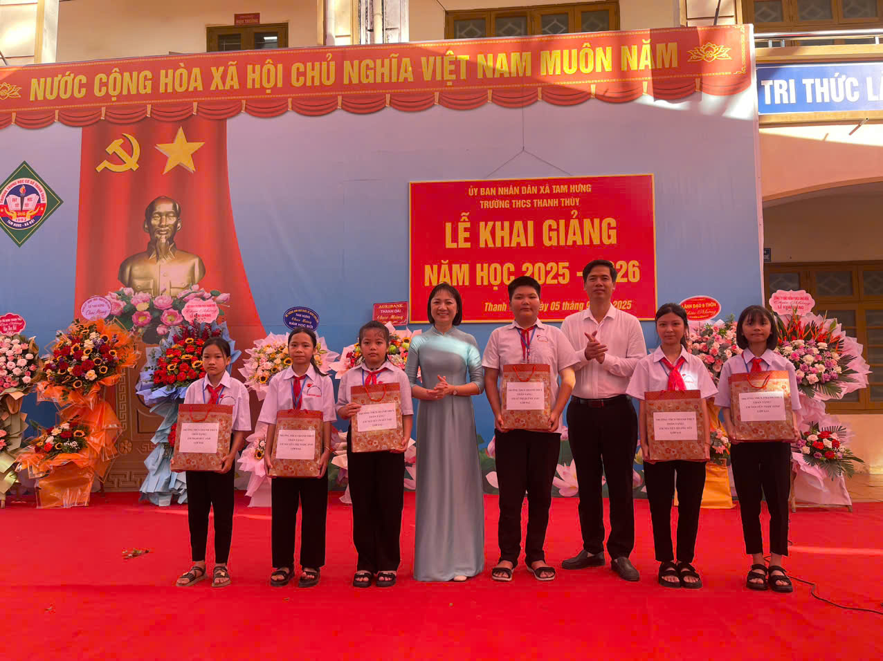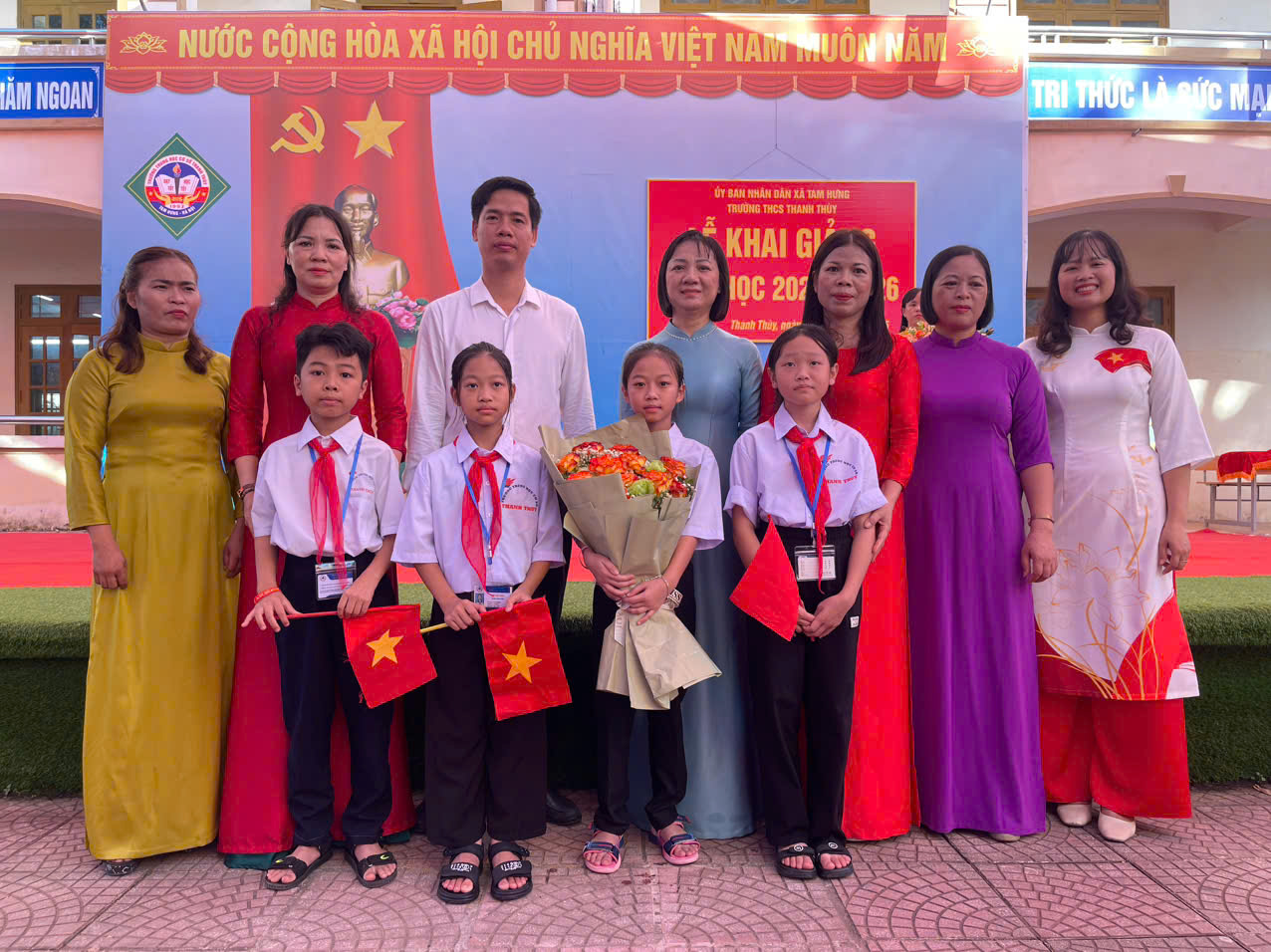 Phần lễ mở đầu được thực hiện trang trọng với nghi thức đón các em học sinh khối 6 – những gương mặt đầu cấp vừa bước vào ngôi trường mới. Các em được các đại biểu, các thầy cô và các anh chị khóa trên tặng hoa và trao lời nhắn gửi thân tình. Khoảnh khắc xúc động ấy trở thành dấu mốc đáng nhớ trong hành trình học tập, rèn luyện dưới mái trường THCS Thanh Thùy.